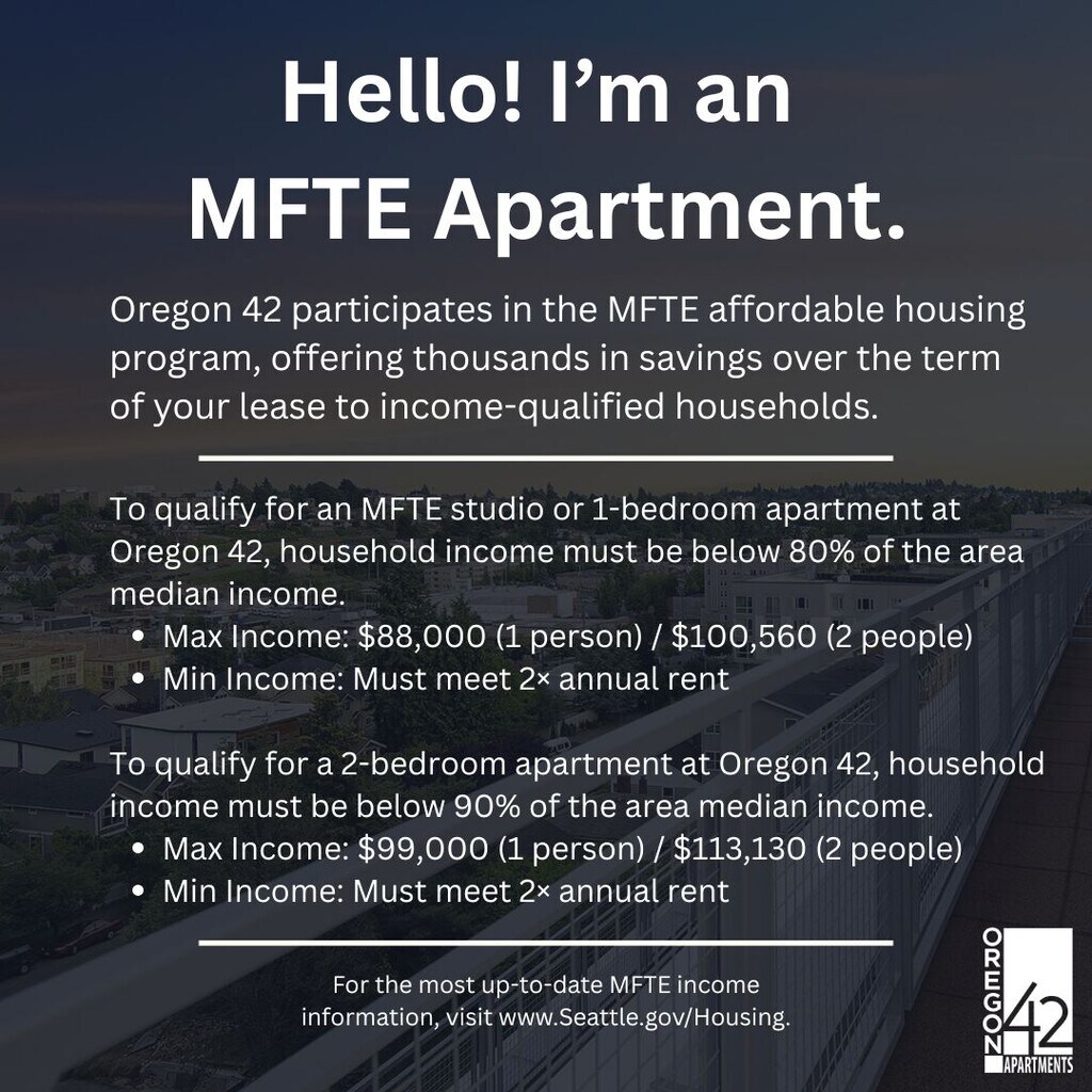 The current rent special at Oregon 42 is: UP TO 1 MONTH FREE! - Oregon 42 is now offering up to 1 MONTH FREE on select apartments! This offer is valid for a limited time. Terms & restrictions apply - contact us for details. Equal Housing Opportunity..