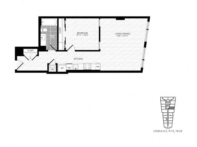 Jr 1F - Floorplan 1 Apartment Unit: 0-1315Apartment Model: Jr 1F$2,6551 Bedroom, 1 Bath, 635 sq ftAvailable NowFloorplan 1D