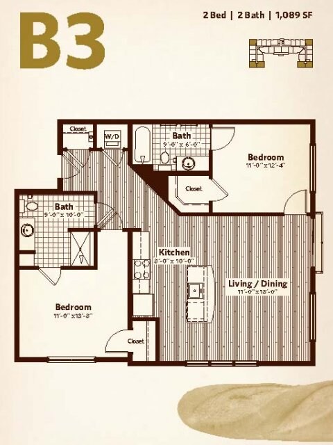 Apartment Model: B3Call For Rates2 Bedroom, 2 Bath, 1089 sq ftUnavailableFloor plans are artist's rendering. All dimensions are approximate. Actual product and specifications may vary in dimension or detail. Not all features are available in every rental home. Prices and availability are subject to change. Base rent is based on monthly frequency. Additional fees may apply, such as but not limited to package delivery, trash, water, amenities, etc. Deposits vary. Please see a representative for details.