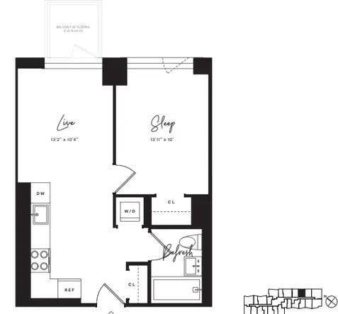 Studio / 1 Bathroom - Floorplan 6 Apartment Unit: 13BApartment Model: Studio / 1 BathroomStudio, 1 Bath, sq ftAvailable NowApartment Unit: 18BApartment Model: Studio / 1 BathroomStudio, 1 Bath, sq ftAvailable Now1 Bedroom