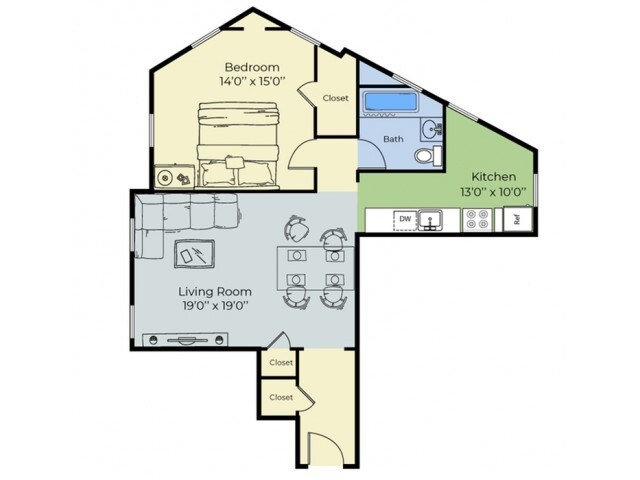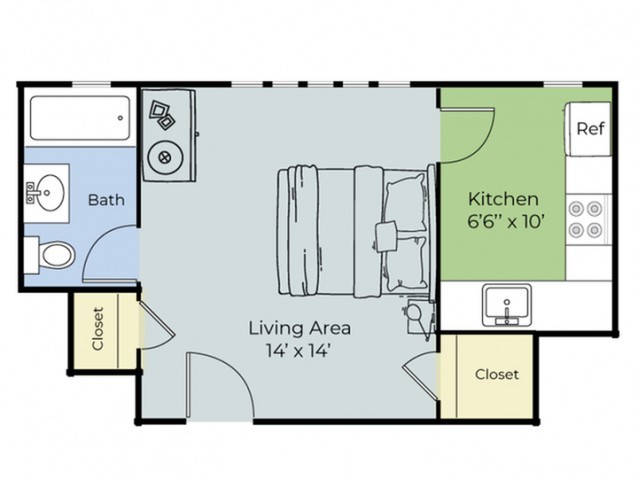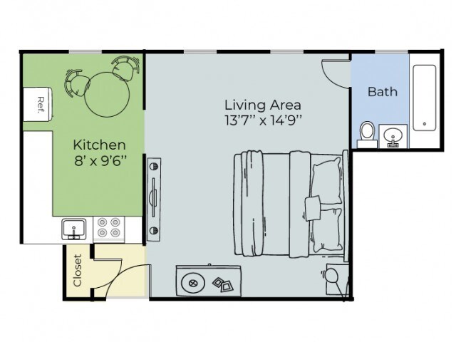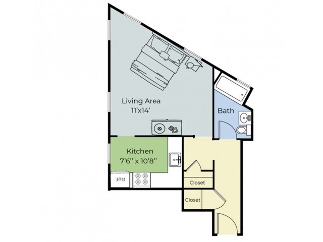 The York - Floorplan 1 Apartment Unit: 1470-69Apartment Model: The YorkStudio, 1 Bath, 335 sq ftAvailable NowThe Addington