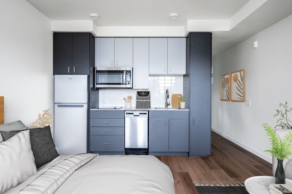 Live connected at Paceline Apartments in North Portland. Each brand-new studio is designed with modern finishes and the convenience of an in-home washer and dryer, while fully furnished studios make moving simple and stress-free. Take in sweeping city views from the rooftop deck or enjoy an effortless commute with the MAX Yellow Line just steps away. Paceline is pet-friendly and perfectly placed near local shops, restaurants, and everyday essentials — giving you the comfort of home and the best of Portland right outside your door.