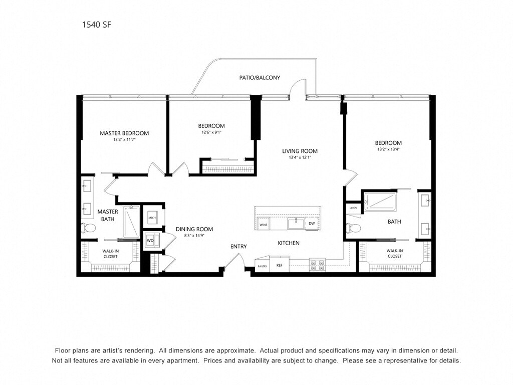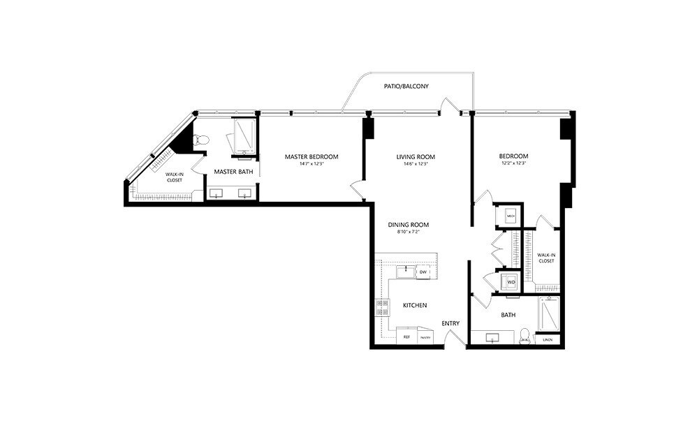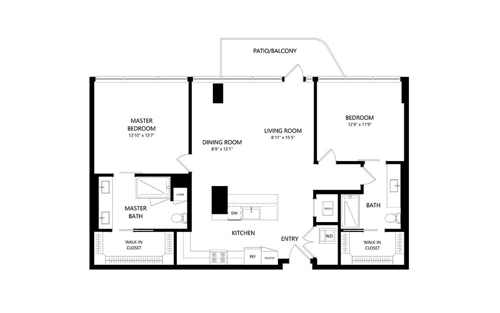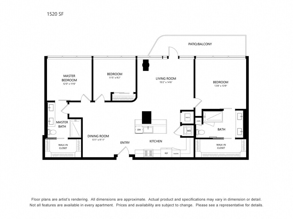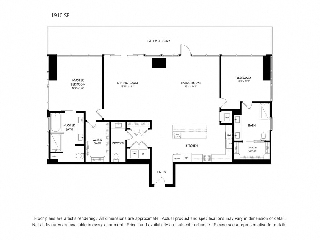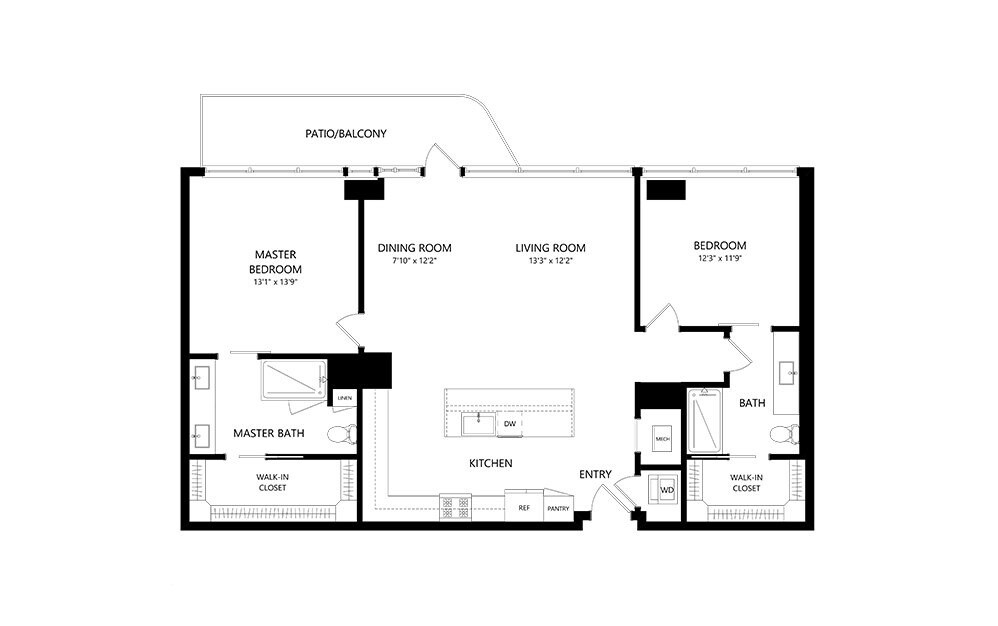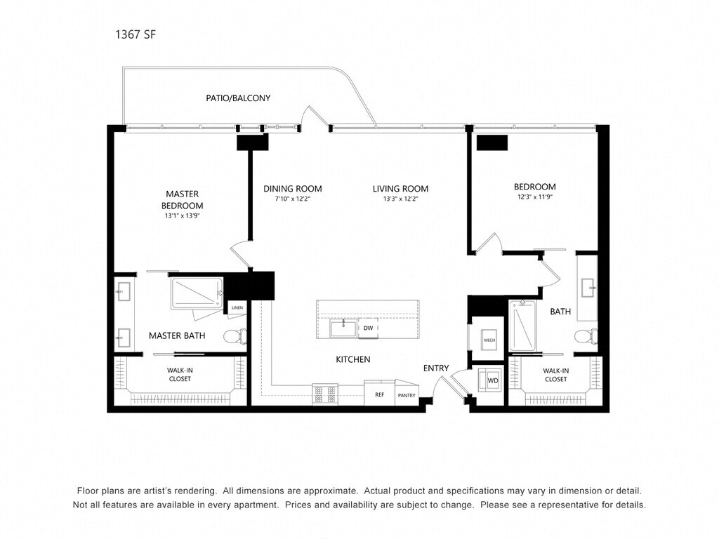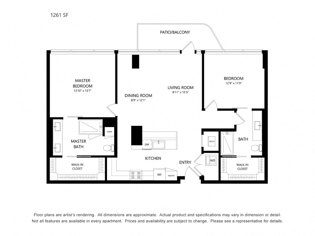 2 Bedroom B - Floorplan 2 Floor plans are artist's rendering. All dimensions are approximate. Actual product and specifications may vary in dimension or detail. Not all features are available in every rental home. Prices and availability are subject to change. Base rent is based on monthly frequency. Additional fees may apply, such as but not limited to package delivery, trash, water, amenities, etc. Deposits vary. Please see a representative for details.