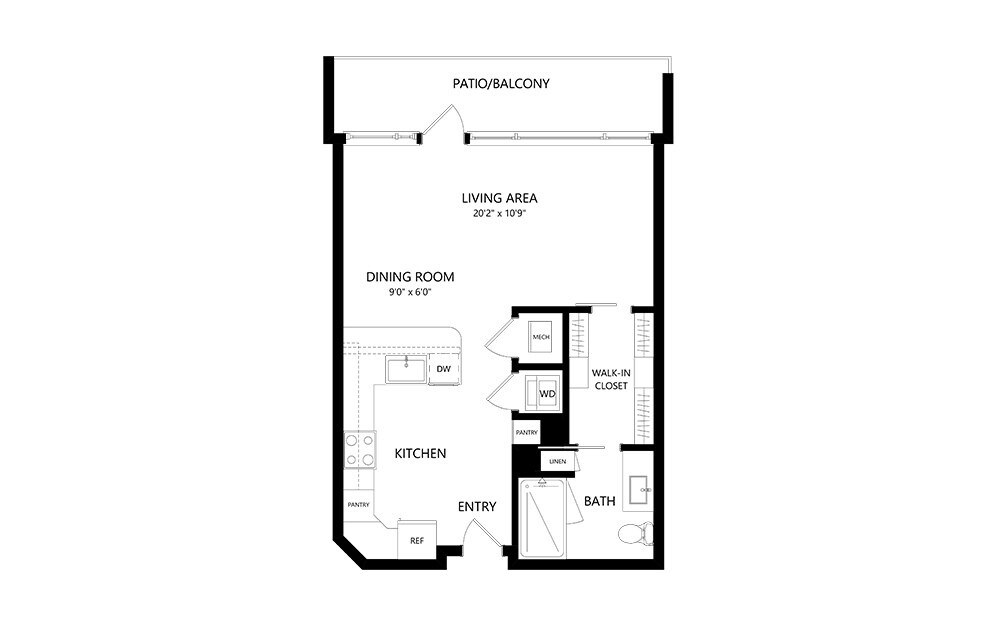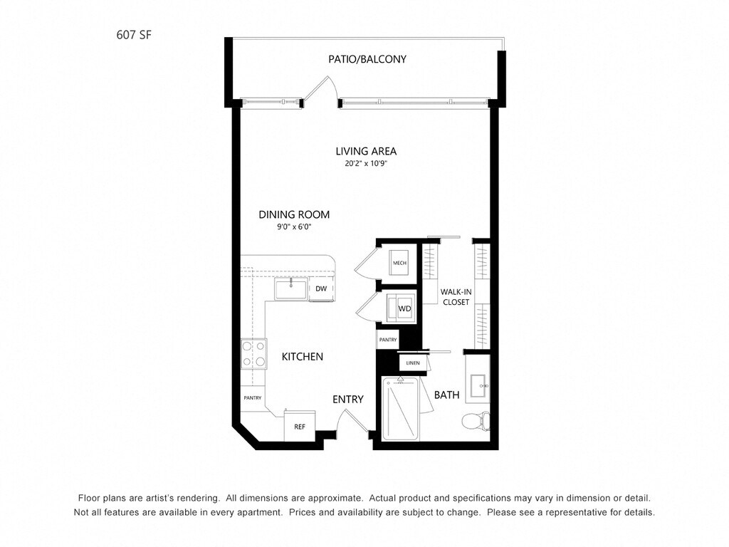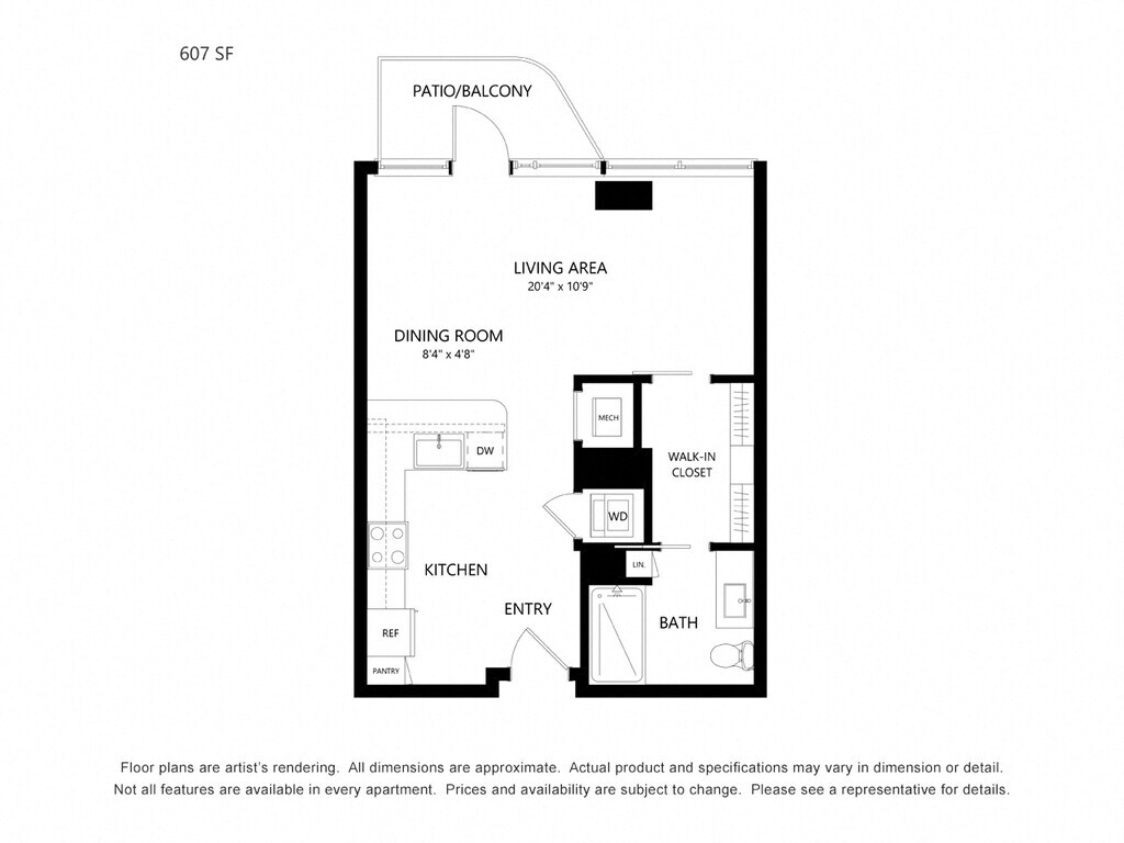 Apartment Model: Studio ACall For RatesStudio, 1 Bath, 607 sq ftUnavailableFloor plans are artist's rendering. All dimensions are approximate. Actual product and specifications may vary in dimension or detail. Not all features are available in every rental home. Prices and availability are subject to change. Base rent is based on monthly frequency. Additional fees may apply, such as but not limited to package delivery, trash, water, amenities, etc. Deposits vary. Please see a representative for details.