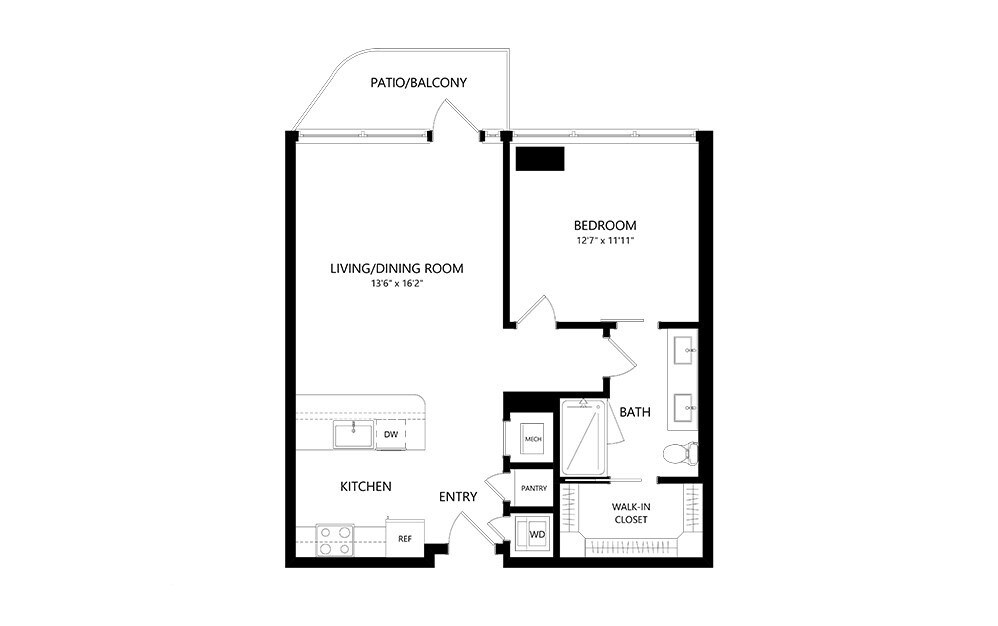 1 Bedroom B - Floorplan 1 Floor plans are artist's rendering. All dimensions are approximate. Actual product and specifications may vary in dimension or detail. Not all features are available in every rental home. Prices and availability are subject to change. Base rent is based on monthly frequency. Additional fees may apply, such as but not limited to package delivery, trash, water, amenities, etc. Deposits vary. Please see a representative for details.