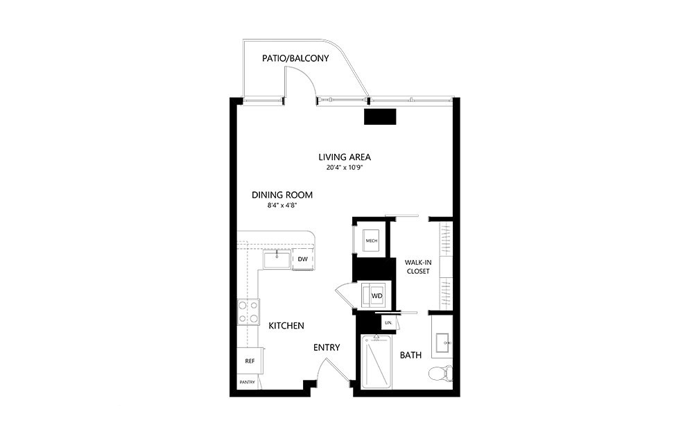 Studio B - Floorplan 1 Floor plans are artist's rendering. All dimensions are approximate. Actual product and specifications may vary in dimension or detail. Not all features are available in every rental home. Prices and availability are subject to change. Base rent is based on monthly frequency. Additional fees may apply, such as but not limited to package delivery, trash, water, amenities, etc. Deposits vary. Please see a representative for details.
