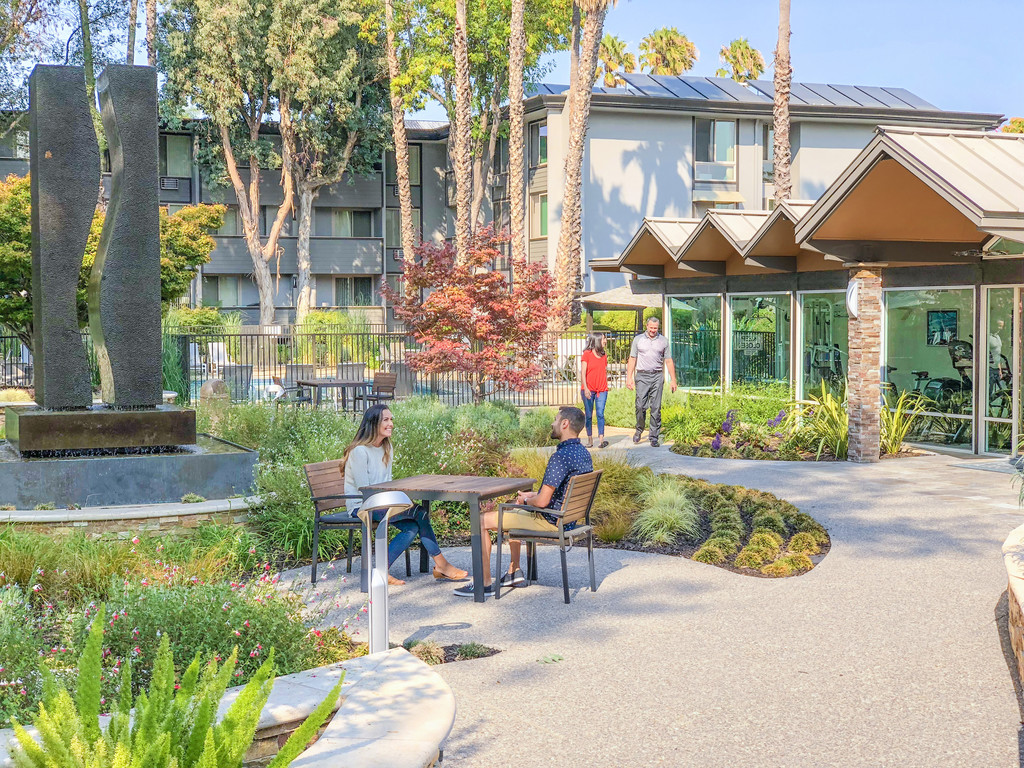 There’s nothing like being able to walk out the door to get everything you need. Craving Starbucks? Check. Need to hit the bank? Check. Want to hop on the Caltrain? Check. Palo Alto Plaza Apartments in Mountain View, CA is a gated apartment community located in the heart of the Mountain View, Palo Alto and Los Altos area. A short walk from the new Village at San Antonio Center and an easy drive to recreation centers such as Shoreline Park, major employers and schools. Our residents love the convenient access our apartment complex offers. Soak up the tranquil waterscape sounds of a one-of-a-kind sculptural fountain as you enjoy the yoga decks or seating areas in the lush central garden. Unwind in the resort-style pool, workout in the outdoor fitness canopy, outdoor spin cycle patio or do yoga in the Yoga/ Stretch Studio. Stop by for a tour of our studio, one or two bedroom apartments and the entire apartment community. We’ll enjoy showing off our bright and spacious Northwest Mountain View apartments with new contemporary wood flooring, espresso cabinetry, quartz counters, stainless steel appliances, Milgard dual-pane windows and sliding balcony doors for quiet and energy efficiency. Covered reserved parking is included and the buildings themselves are controlled access and feature welcoming lobbies in both of them and also includes Electric Vehicle Charging Stations. We even have The Hub, a co-work space with complimentary WiFi for you to relax with your laptop and earbuds, and if you need privacy for a zoom call, we offer a sound proof pod in the lobby. We also offer EV charging stations on-site for extra convenience. Experience the fun in The Game Lounge with billiards, shuffleboard, foosball and even a retro video game.