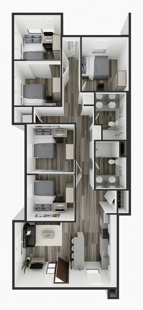 Studio - Rosa - Floorplan 2 Apartment Unit: Standard BedroomApartment Model: Studio - Rosa$2,475Studio, 1 Bath, 352 sq ftAvailable August 18, 20264 Bedrooms