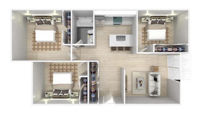 Availability Date Unit Sq Ft Unavailable Three Bedroom One Bath 904 sq ft Apartment Model: Three Bedroom One Bath3 Bedroom, 1 Bath, 904 sq ftUnavailableThree Bedroom One Bath - Floorplan 1