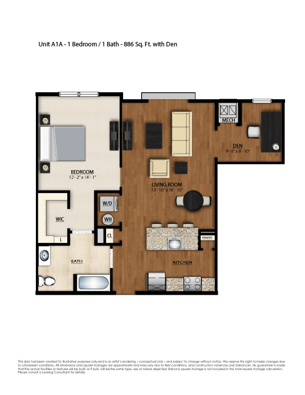 Apartment Model: A1A-FFrom $2,6001 Bedroom, 1 Bath, 886 sq ftAvailable NowFloor plans are artist's rendering. All dimensions are approximate. Actual product and specifications may vary in dimension or detail. Not all features are available in every rental home. Prices and availability are subject to change. Base rent is based on monthly frequency. Additional fees may apply, such as but not limited to package delivery, trash, water, amenities, etc. Deposits vary. Please see a representative for details.