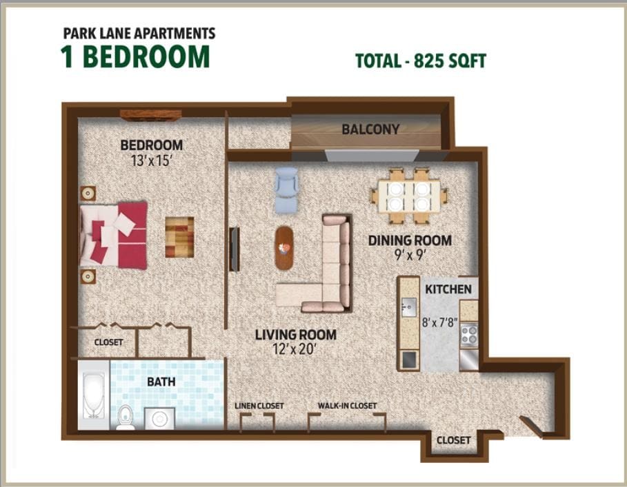 Apartment Model: The Aspen PL 11 & 15$1,2251 Bedroom, 1 Bath, 630 sq ftAvailable October 15, 2025The Aspen PL 11 & 15 - Floorplan 1 The Hickory PL