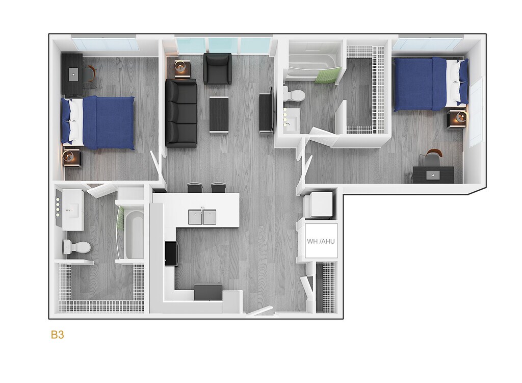 3x3 - Floorplan 3 Apartment Unit: PrivateApartment Model: 3x33 Bedroom, 3 Bath, 1147 sq ftAvailable Now3x3 Premium