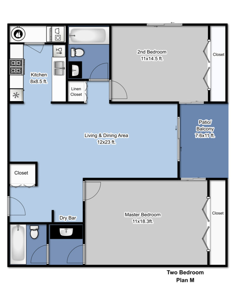 - 2 Bedrooms- Plan M2 Beds, 2 Baths, 1080 sq ft- Model Gallery- Floorplans- Availability Details- Price - Availability Date - Unit - Sq Ft - From $1,415 - Call for Availability - Plan M - 1080 sq ft - Model Amenities and Features- Features- High Speed Internet Access
