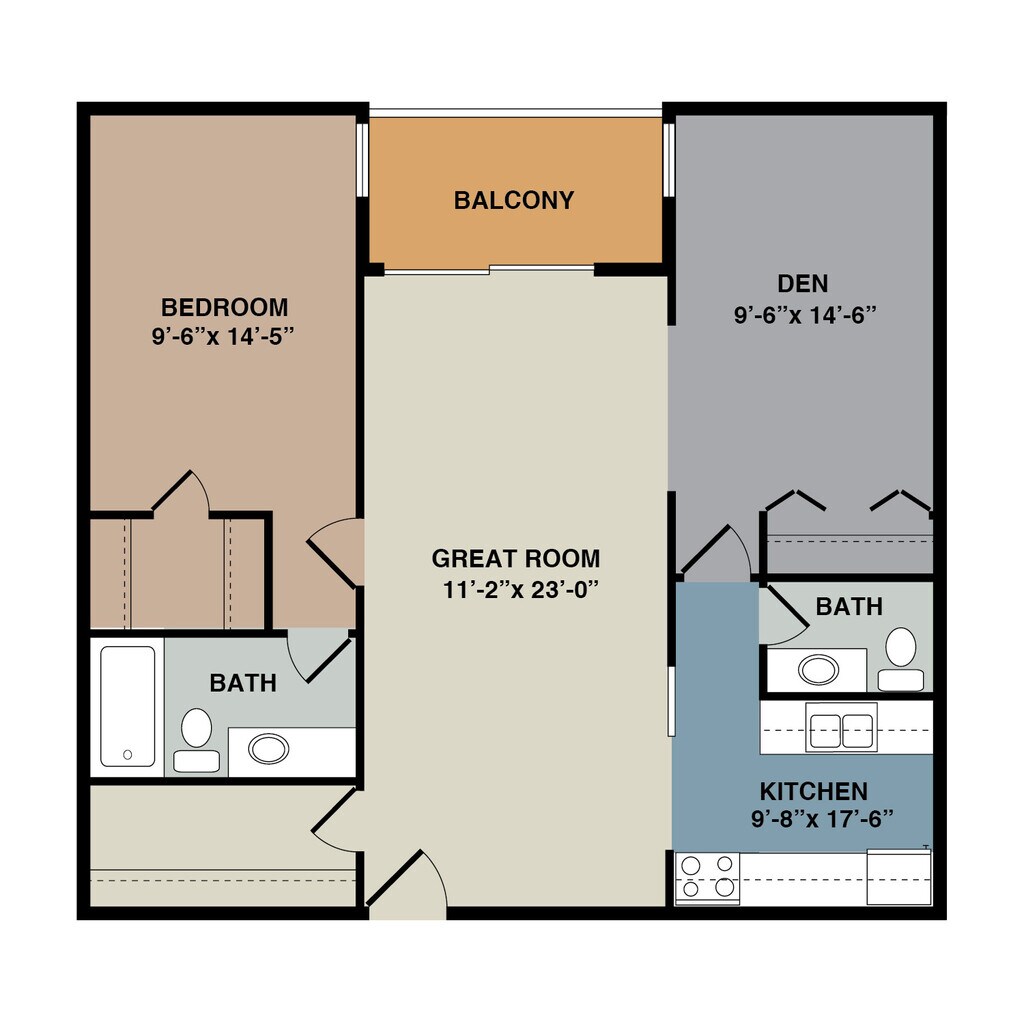1 Bedroom + Den - Floorplan 2 Apartment Unit: 310Apartment Model: 1 Bedroom + Den$1,0401 Bedroom, 1.5 Bath, 860 sq ftAvailable Now1 Bedroom