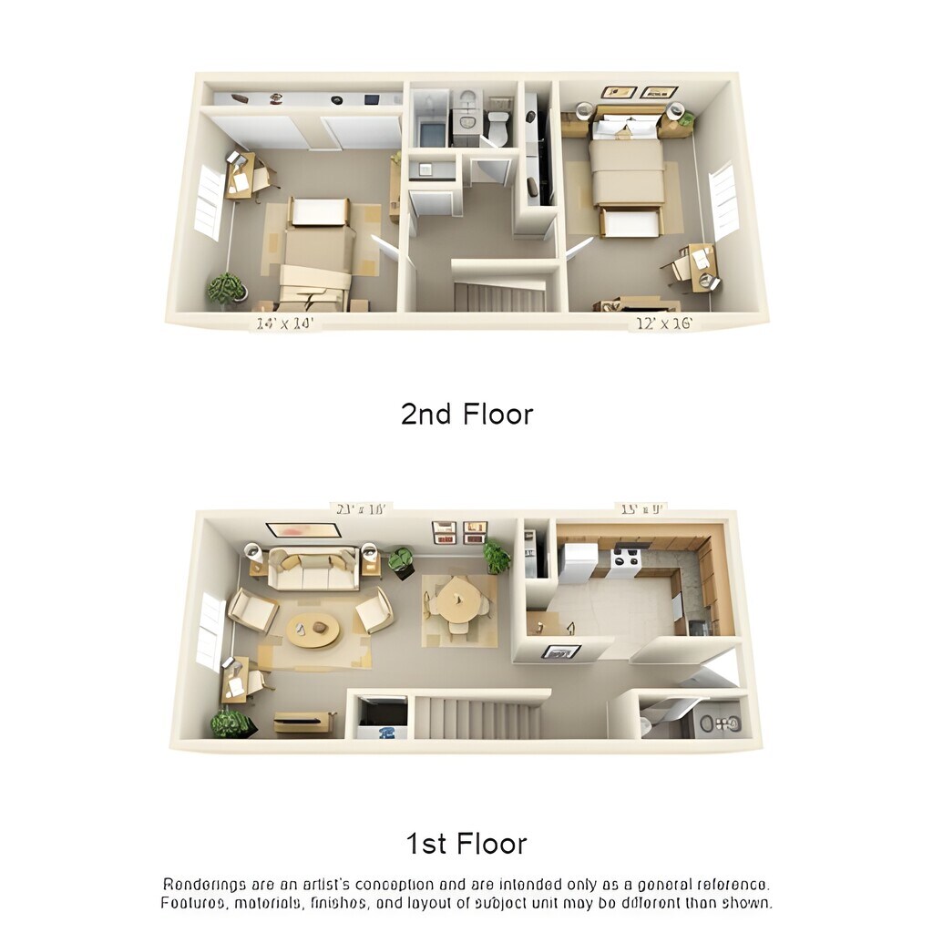 Apartment Model: 2 BedroomFrom $1,2302 Bedroom, 1 Bath, 700-1035 sq ftUnavailable![]() - 2 Bedroom - Floorplan 1 - 2 Bedroom Townhome2 Beds, 1.5 Baths, 1000 sq ft- Model Gallery- Floorplans- Availability Details- Price - Availability Date - Unit - Sq Ft - $1,530 - Call for Availability - 2 Bedroom Townhome - 1000 sq ft - Model Amenities and Features- Features- High Speed Internet Access