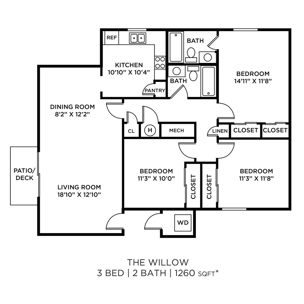 Apartment Model: WillowFrom $1,1753 Bedroom, 2 Bath, 1260 sq ftAvailable Now![]()