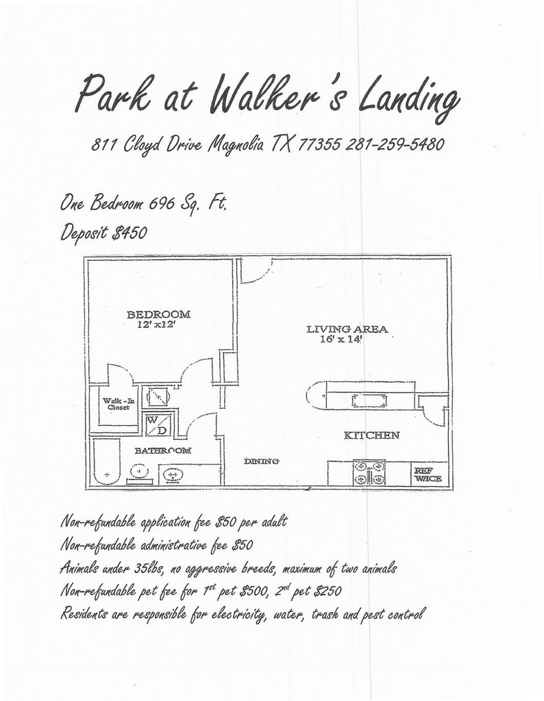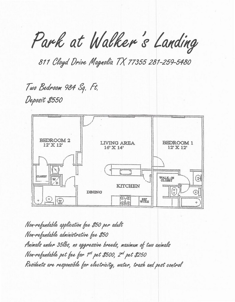 Located in quaint and historical Magnolia, Texas, the Park at Walkers Landing apartment community offering very spacious and extremely affordable one- and two-bedroom apartment homes, featuring individual private entrances and balconies, fireplaces, oversized walk-in closets, fully equipped kitchens with a built in microwaves, and washers and dryers or stackable connections in each unit. We are nestled the amongst the trees in a park like setting, just minutes from all major highways, fine dining, and only about five minutes from the Renaissance festival and other local activities. This is truly relaxed country living just outside of the big city! Here at Park at Walkers Landing, you’ll enjoy only the finest in community and residence amenities, including a sparkling swimming pool and built-in barbeque areas. We also offer professional, emergency maintenance 24-hours a day, 7 days a week so our residents are worry-free. At Park at Walkers Landing Apartments, you’ll discover more than just a place to live – you’ll find a lifestyle you’ve worked hard to attain and we’re here to make sure you enjoy every minute. Pet Friendly- weight & breed restrictions apply. Please call us at 281-259-5480. 2nd chance apartment community.