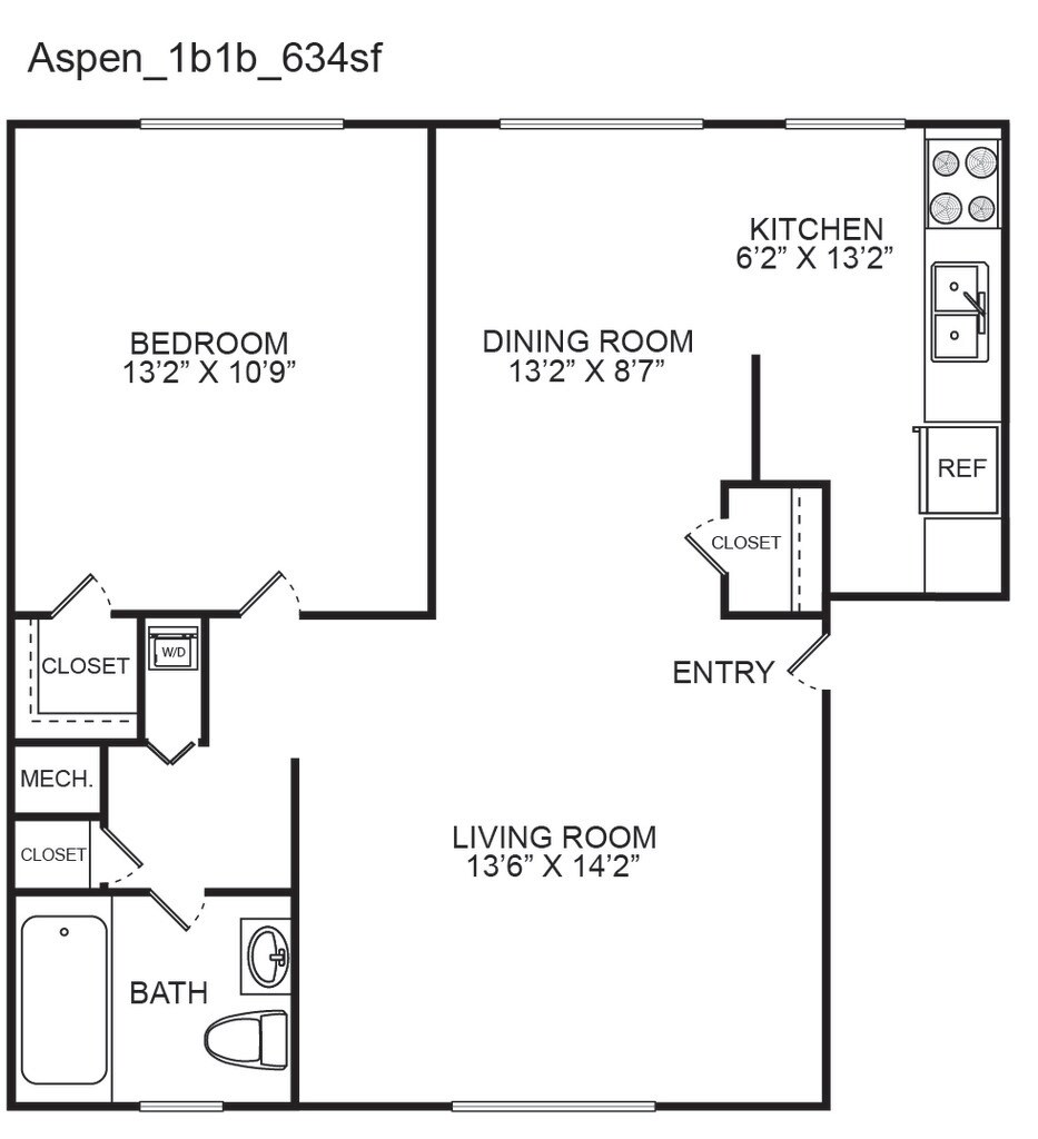 Apartment Model: The Aspen$1,2991 Bedroom, 1 Bath, 634 sq ftUnavailable![]()
