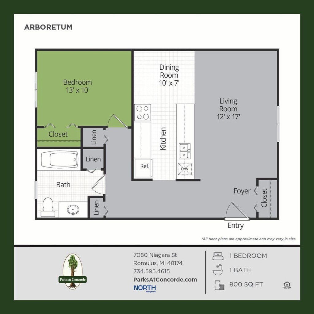 Apartment Model: Arboretum - 2nd Floor$1,1051 Bedroom, 1 Bath, 800 sq ftAvailable December 15, 2025FloorplansPhotos![]()