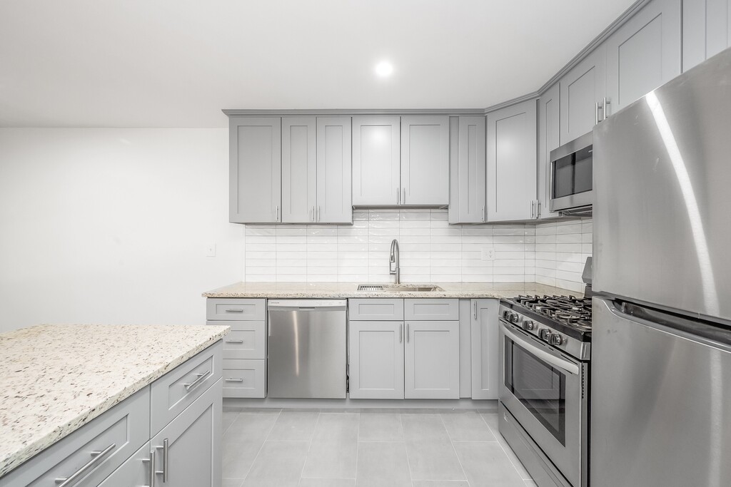 Garden style apartments, many newly renovated with recessed lighting throughout. New kitchen with island, granite counter tops, stainless appliances (fridge/freezer, dishwasher, range, and over the range microwave), crown molding, and new backsplash. Most apartments have a porch, and all come with free parking and a free storage unit. Many improvements to come including: renovating all of the common spaces, and new windows.