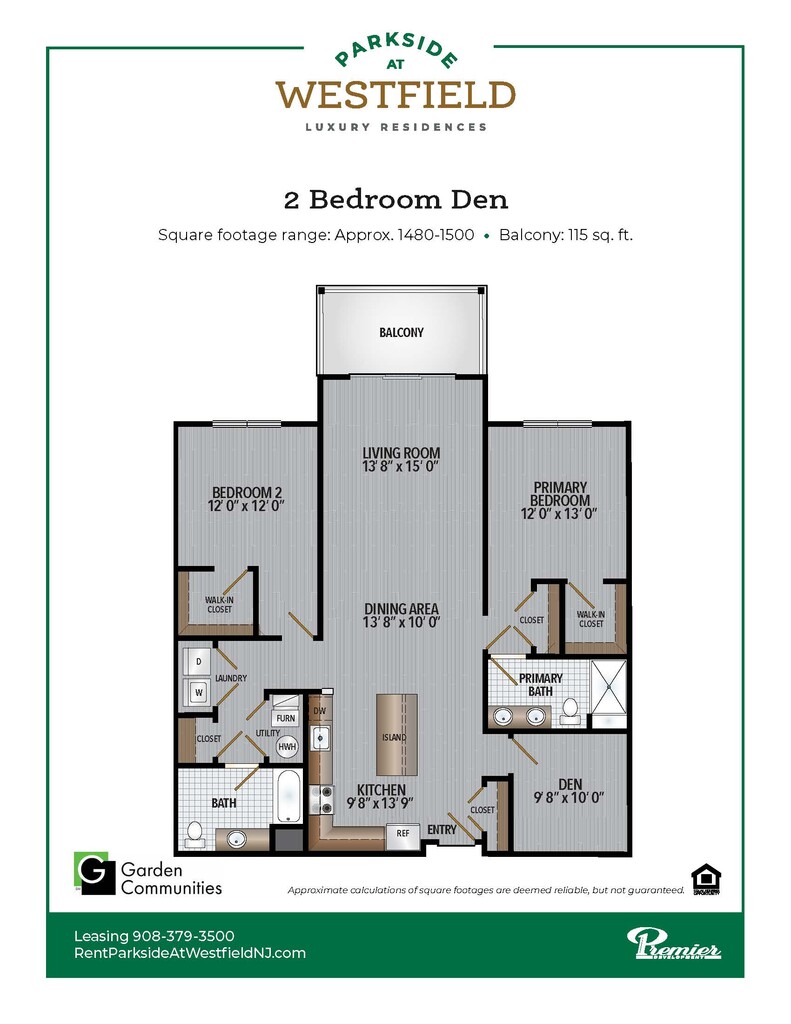 Apartment Model: $3.04/sq.ft. - Two Bedroom Den$4,4952 Bedroom, 2 Bath, 1478-1497 sq ftAvailable Now![]()