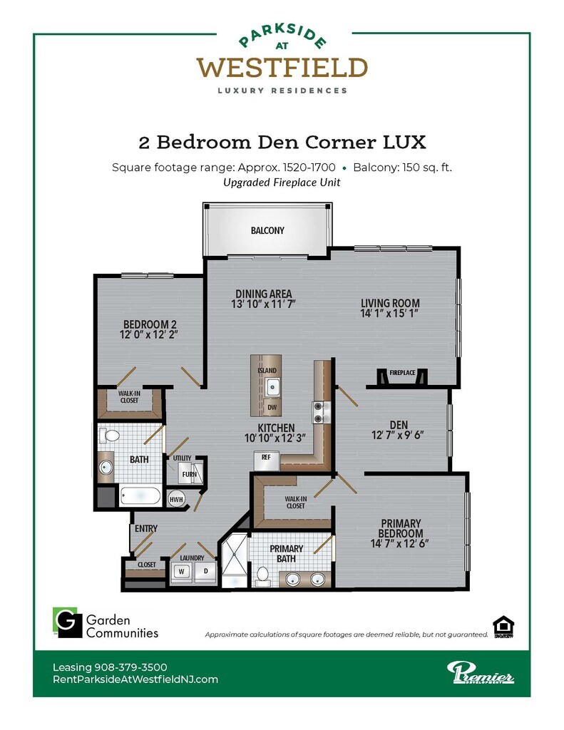 $3.04/sq.ft. - Two Bedroom Den - Floorplan 1 Apartment Unit: APT4Apartment Model: $3.04/sq.ft. - Two Bedroom Den$4,4952 Bedroom, 2 Bath, 1478-1497 sq ftAvailable Now$3.19/sq.ft. - Two Bedroom Den Corner LUX