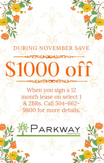 The current rent special at Parkway Apartments is: FIVE WEEKS FREE RENT!~~LIMITED TIME SPECIAL UNTIL NOVEMBER 30, 2025: 5 WEEKS FREE RENT!!!! *with a 12 month lease..