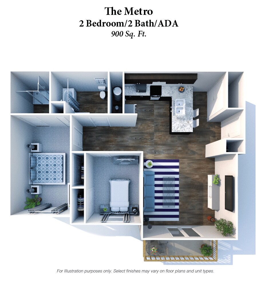 Availability Date Unit Sq Ft Call for Availability The Metro: Two Bedroom, Two Bathroom ADA 900 sq ft Model Amenities and Features