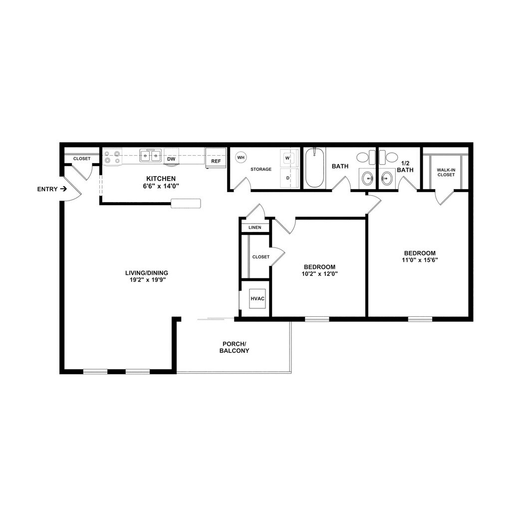 1 Bedroom/1 Bath at Parkwood - Floorplan 5 2 Bedrooms