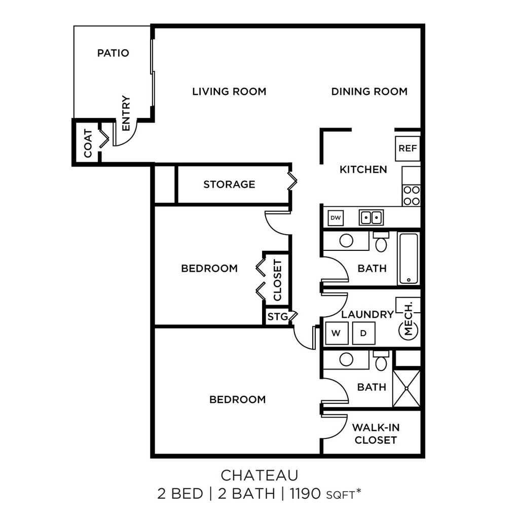 Apartment Model: Two Bedroom 2 Bath - 1,190 sqftFrom $1,4752 Bedroom, 2 Bath, 1190 sq ftAvailable Now![]()