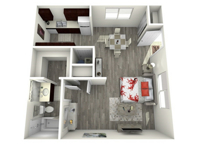 Apartment Model: Studio, 1 Bath (80% Income Restricted)From $715Studio, 1 Bath, 490 sq ftAvailable February 10, 2026FloorplansPhotos![]()