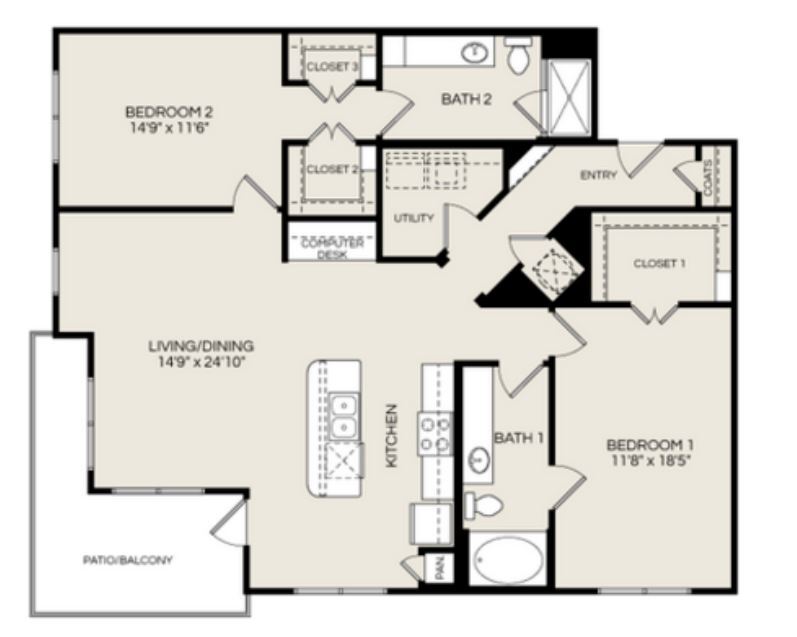 1 Bed, 1 Bath, 843 sq ftAvailable NowLargest 1 BedroomThis is the largest 1 Bedroom at this PropertyModel Gallery