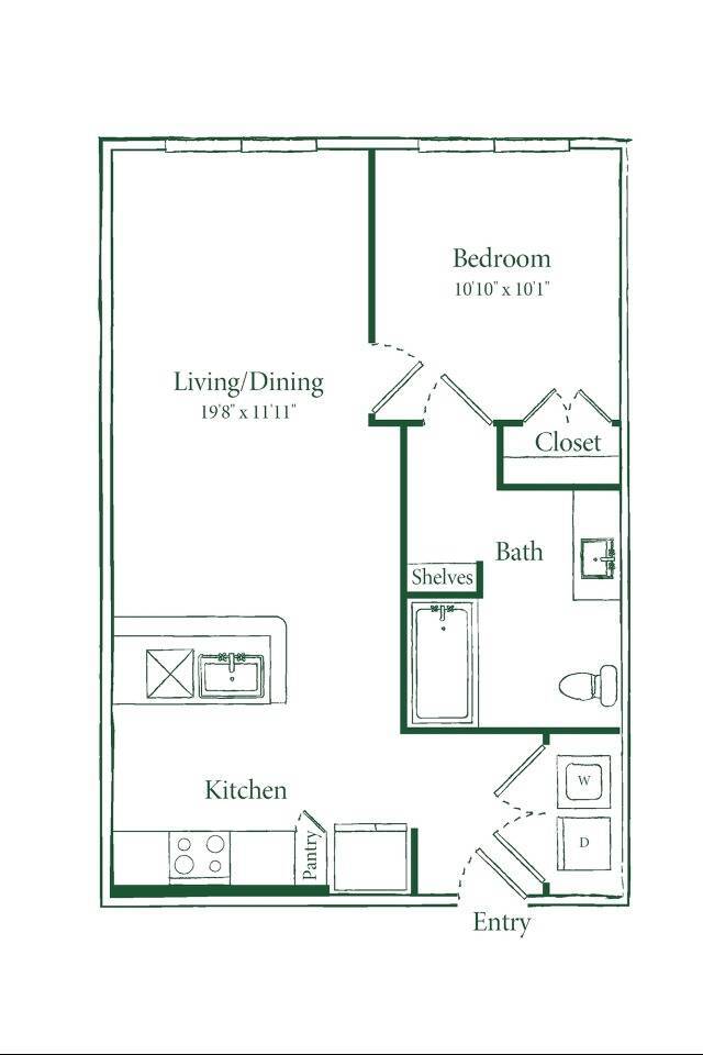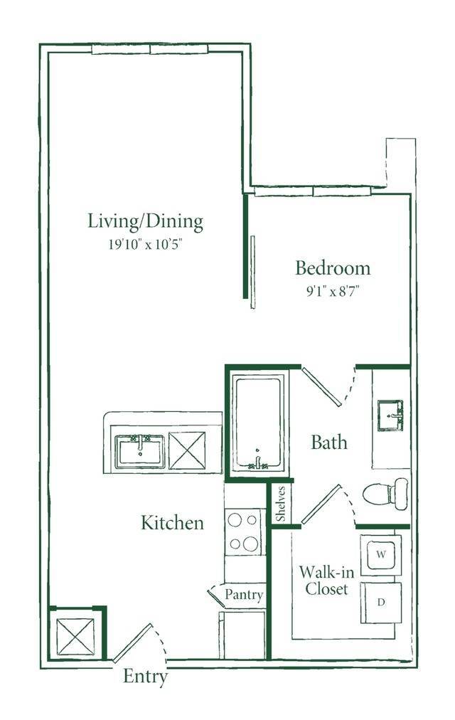 Apartment Model: HD-E1Call For RatesStudio, 1 Bath, 496 sq ftUnavailableFloor plans are artist's rendering. All dimensions are approximate. Actual product and specifications may vary in dimension or detail. Not all features are available in every rental home. Prices and availability are subject to change. Base rent is based on monthly frequency. Additional fees may apply, such as but not limited to package delivery, trash, water, amenities, etc. Deposits vary. Please see a representative for details.