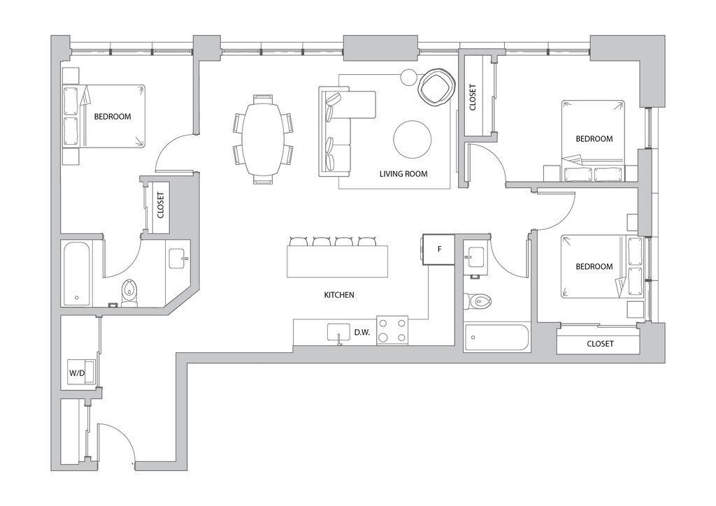 - Raised ceilings - Large operable windows - Luxury finishes - Primary bedroom with ensuite featuring his & hers sinks and walk-in closet - Two additional bedrooms with spacious closets - Second full bathroom plus additional half bath - In-suite laundry - Pet-friendly - Tenant-controlled heat & AC - Water & heat included Building Highlights: - Direct connection to the +15 network, Secure entry and management.