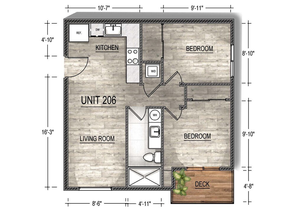 Apartment Unit: 206Apartment Model: 2BR/1.0BA2 Bedroom, 1 Bath, 624 sq ftAvailable Now![]()
