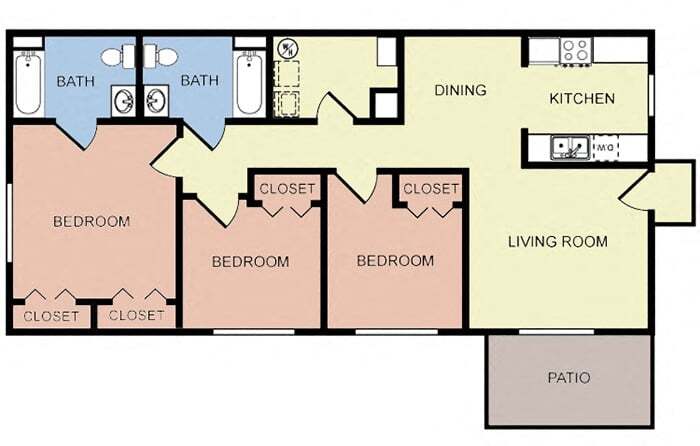Apartment Model: 3 BR Ranch$1,5703 Bedroom, 2 Bath, 1048 sq ftAvailable November 14, 2025![]()