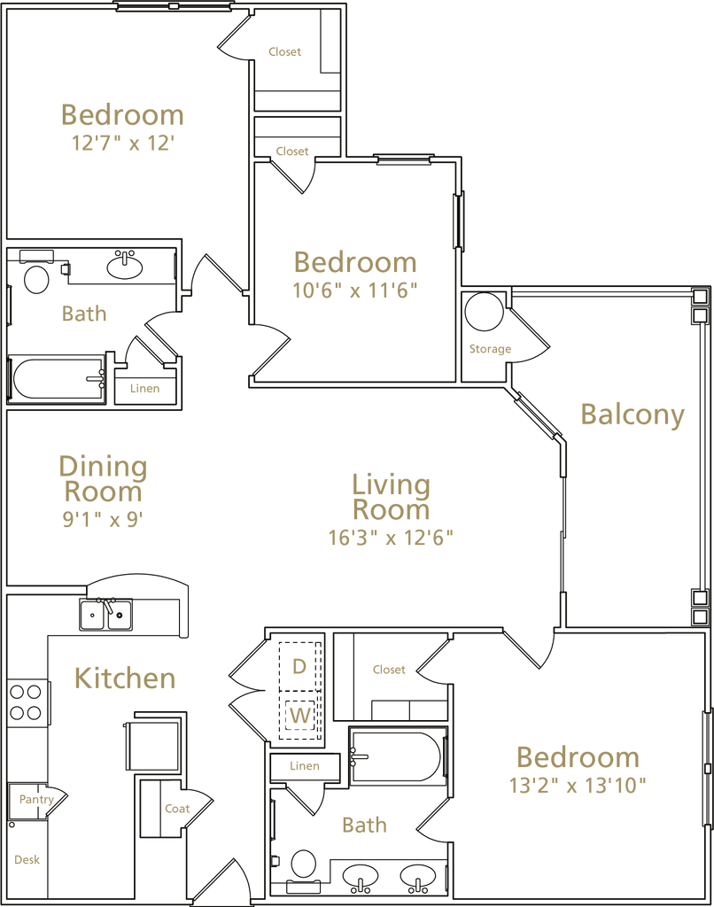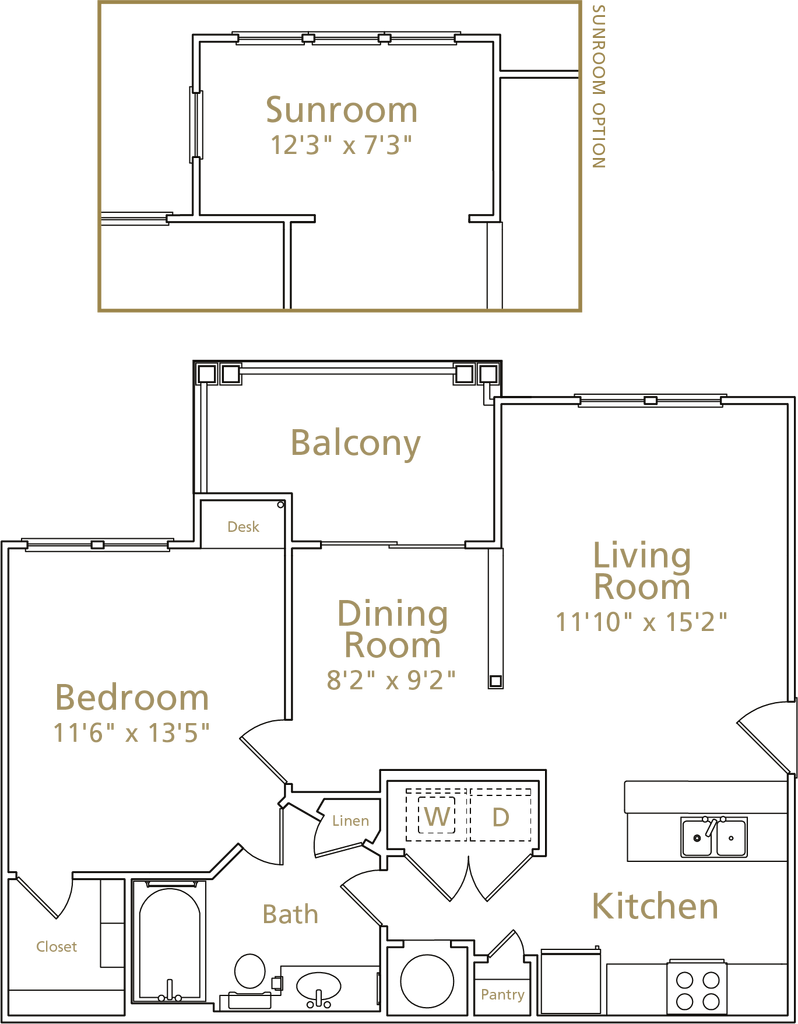1 Bed, 1 Bath, 743-829 sq ftAvailable NowLargest 1 BedroomThis is the largest 1 Bedroom at this PropertyModel Gallery