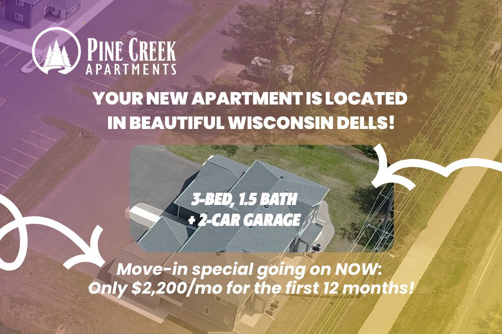 Convenience surrounded by nature.....Great location and condo-style luxury in a private, wooded setting. Pine Creek is Lake Delton's newest and most exceptional apartment community. One, two and three bedroom apartments with private entrances and deck or patio. Our exceptional location features shopping and services all outside your front door. Easy access to I90/94 and the heart of Wisconsin Dells vacation area make Pine Creek an ideal neighborhood. Carefree living for your individual style. Your home at Pine Creek is designed to reflect your unique lifestyle. We offer 5 different floor plans including 3 bedroom townhomes. Some of our units include studies and cathedral ceilings. Our apartments also each feature a full size washer and dryer. Our professional and experienced staff perform all property maintenance, including lawn care and snow removal, so your life is comfortable and worry-free! COMPLEX MANAGED BY HOLTZ & ASSOCIATES MANAGEMENT. VISIT THEIR WEBSITE TODAY FOR MORE INFORMATION AND TO COMPLETE A RENTAL APPLICATION.
