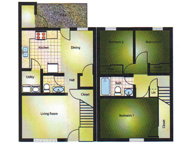 Apartment Model: 3 Bed Townhouse3 Bedroom, 1.5 Bath, 974 sq ftUnavailable3 Bed Townhouse - Floorplan 1
