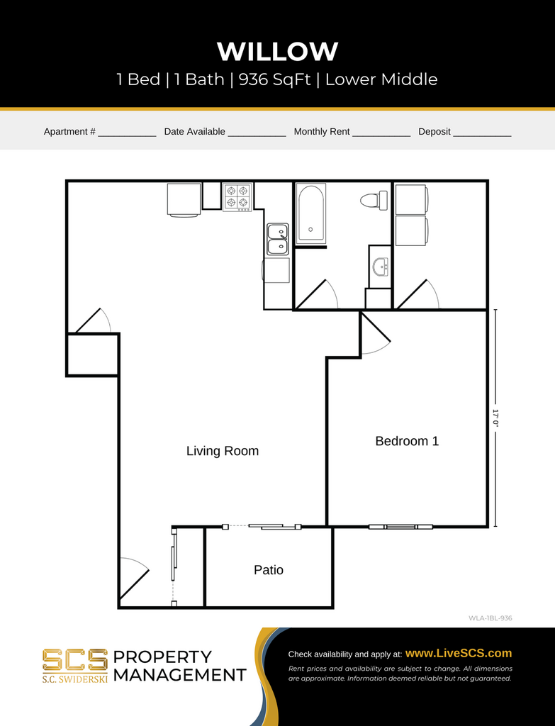 Apartment Model: Willow 1 BR Lower1 Bedroom, 1 Bath, 936 sq ftAvailable December 1, 2025FloorplansPhotos![]()