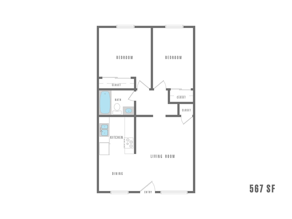 Apartment Model: 2 Bedroom 1 BathFrom $9802 Bedroom, 1 Bath, 567-750 sq ftAvailable NowFloor plans are artist's rendering. All dimensions are approximate. Actual product and specifications may vary in dimension or detail. Not all features are available in every rental home. Please see a representative for details.