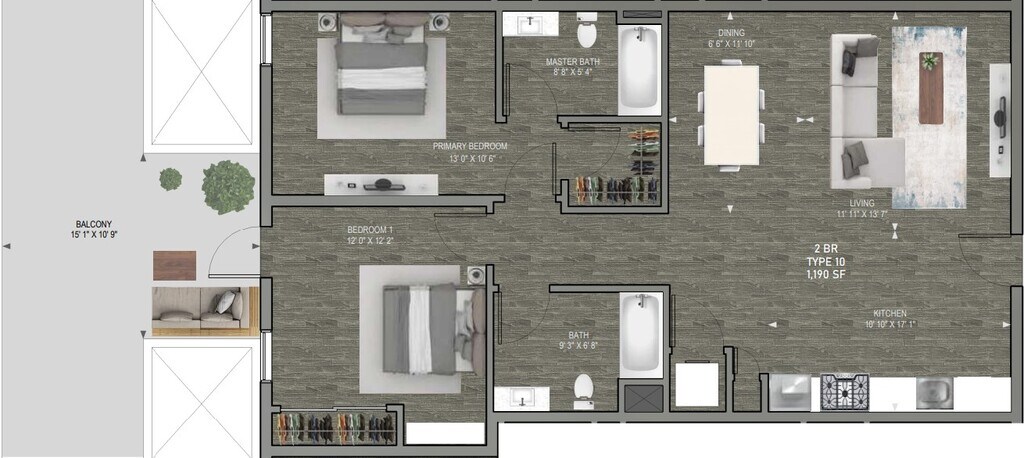 Apartment Model: Type 10$2,9962 Bedroom, 2 Bath, 1190 sq ftAvailable NowType 10 - Floorplan 1 Apartment Unit: 103Apartment Model: Type 10$3,1672 Bedroom, 2 Bath, 1190 sq ftAvailable Now