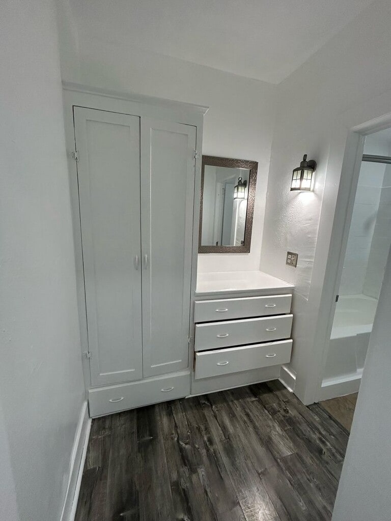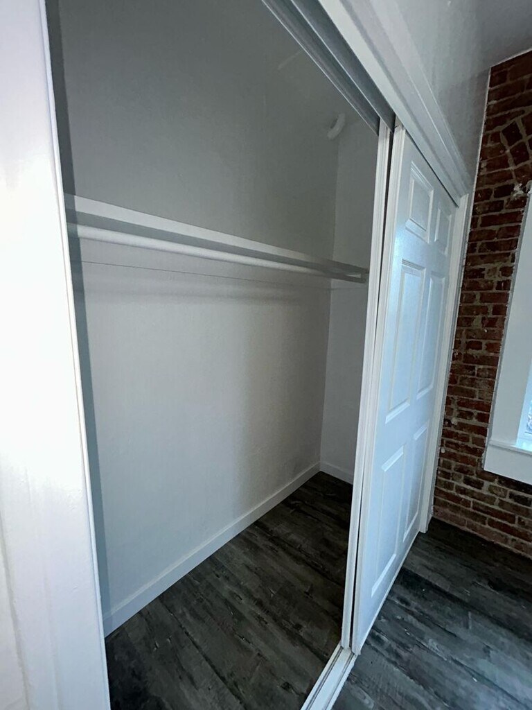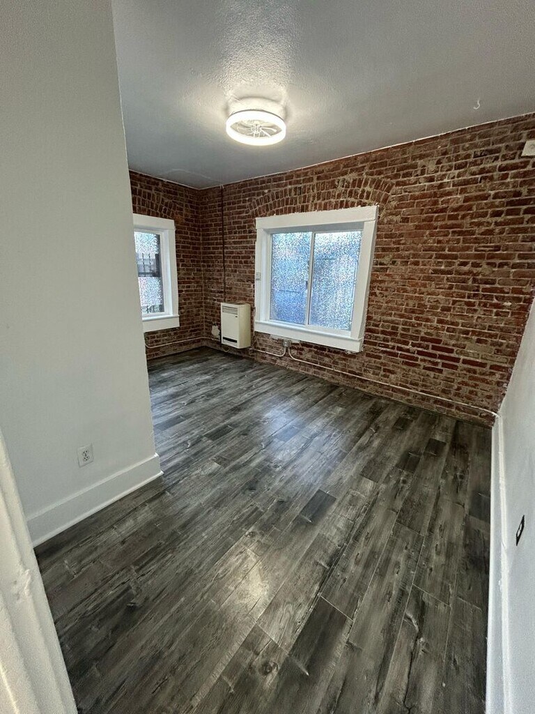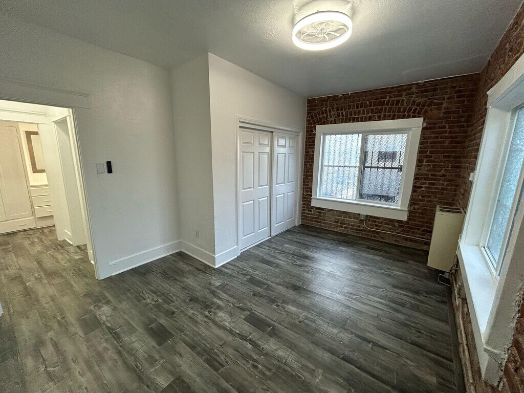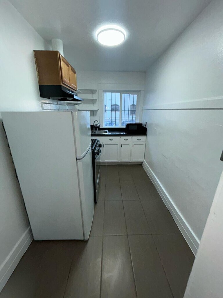 - Unit Description- This corner bottom-floor studio combines modern upgrades with timeless character. Step through a sophisticated and inviting entry into a refreshed living space featuring exposed red brick walls, new LED lighting, and energy-efficient dual-pane windows that provide comfort and style. The updated kitchen offers a sleek black-and-white aesthetic with granite-style countertops, a gas stove, microwave, and white cabinetry. The bathroom has been fully remodeled with a refinished tub, pedestal sink, modern fixtures, and tiled flooring for a clean, polished look. A built-in wardrobe and mirrored vanity area provide ample storage while adding functional elegance to the space. This unit’s corner location on the ground level ensures privacy and convenience, perfect for those seeking a modern, efficient layout in a well-maintained building. Highlights: Corner bottom-floor unit Exposed brick accent wall Updated kitchen with new stove and microwave Refinished bathroom with modern fixtures Built-in storage and mirrored vanity Dual-pane windows New LED lighting throughout Lease Terms: Tenant responsible for utilities (Gas, Electric, Water, Sewer, Trash under Conservice). Street parking or limited assigned parking (if available). Ideal for: Individuals or couples who appreciate modern finishes with vintage charm in a central Los Angeles location. - Model Rent and Fees- Price- $1,500