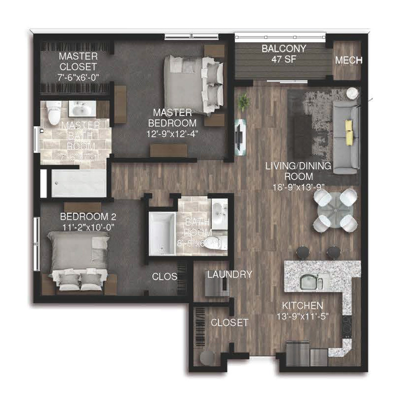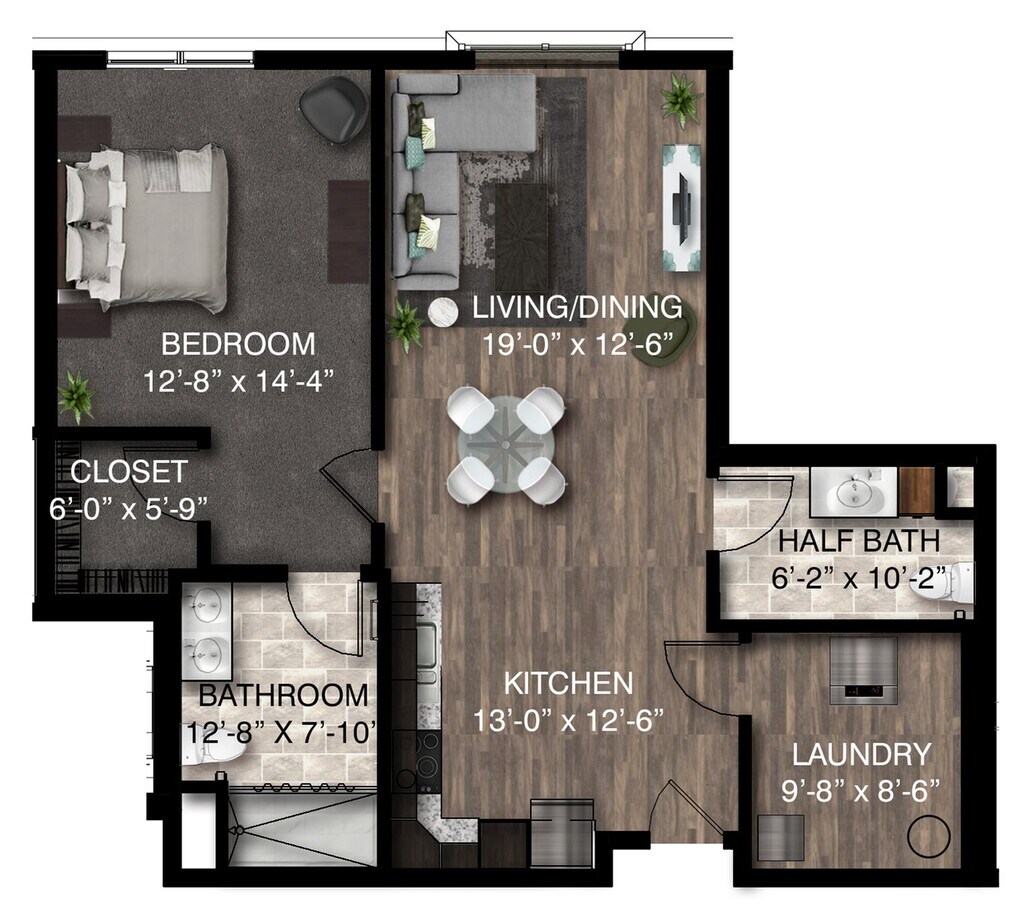 1 Bed, 1.5 Baths, 1258 sq ftAvailable NowLargest 1 BedroomThis is the largest 1 Bedroom at this PropertyModel Gallery