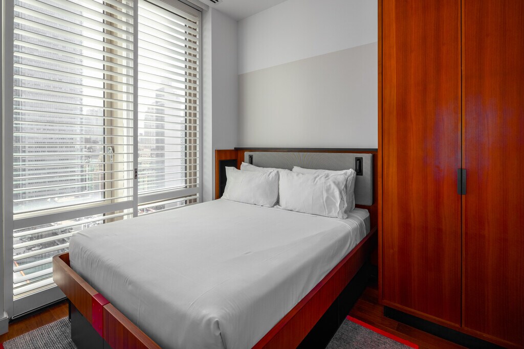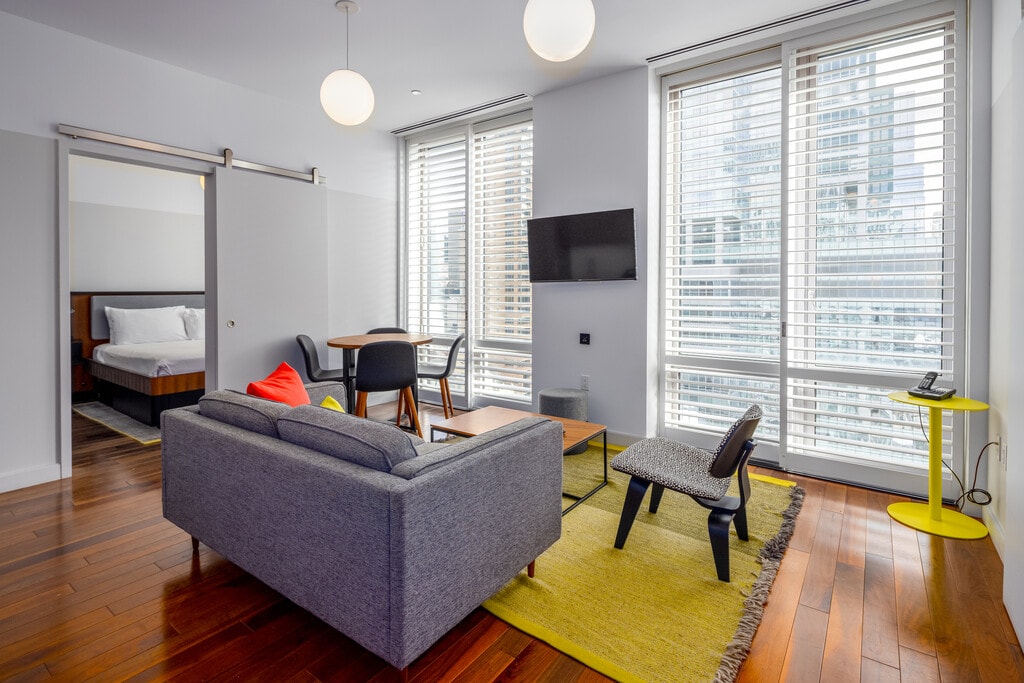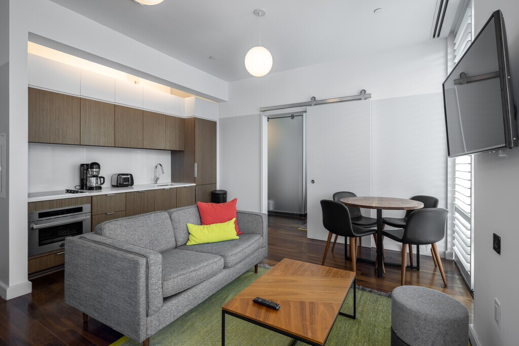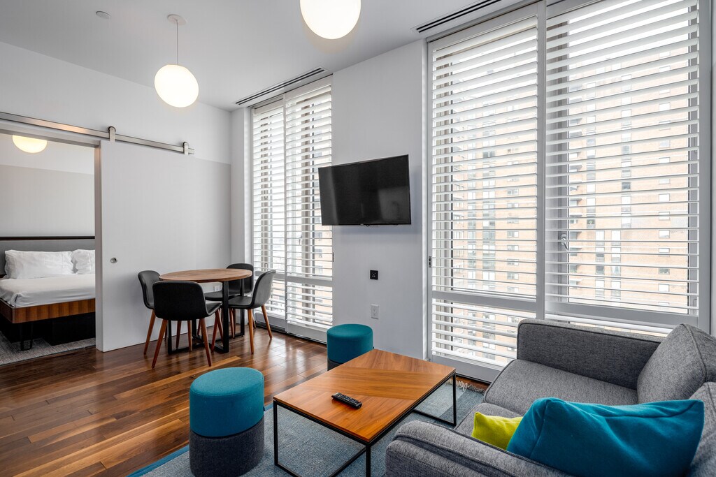 Pod Pads are One & Two Bedroom Fully Furnished Apartments situated at the top of Pod Times Square Hotel. We offer Luxury Boutique convenience and hospitality with all the comforts of a home. Beautiful sun drenched One- & Two-Bedroom Pod Pads. Featuring floor-to-ceiling windows, elegant walnut floors, and panoramic city views. Kitchens fully stocked, offering Bertazzoni ovens and Blomberg appliances. Quartz countertops, and custom mill work. Two-Three Flat Screen TVs, one in each bedroom and living area. Marble bathrooms accoutered with top-of-the-line Hansgrohe fixtures and walk-in showers. Individual Climate Control in each room and living area. High Speed Wi-Fi & Premium Cable. Safe for valuables. Landline phone service with Free Calling. HSKP Services upon request. Minimum 30 Night Stay. Terms & Conditions apply. Rent payable by credit with Zero Processing Fees. Easy & simple National & International Approval & Lease Process. Monthly contracts can be completed in less than a day. Small Security Deposit. Pay first month upon arrival. Close to all the action, but just far enough away—and high above—the hustle and bustle.