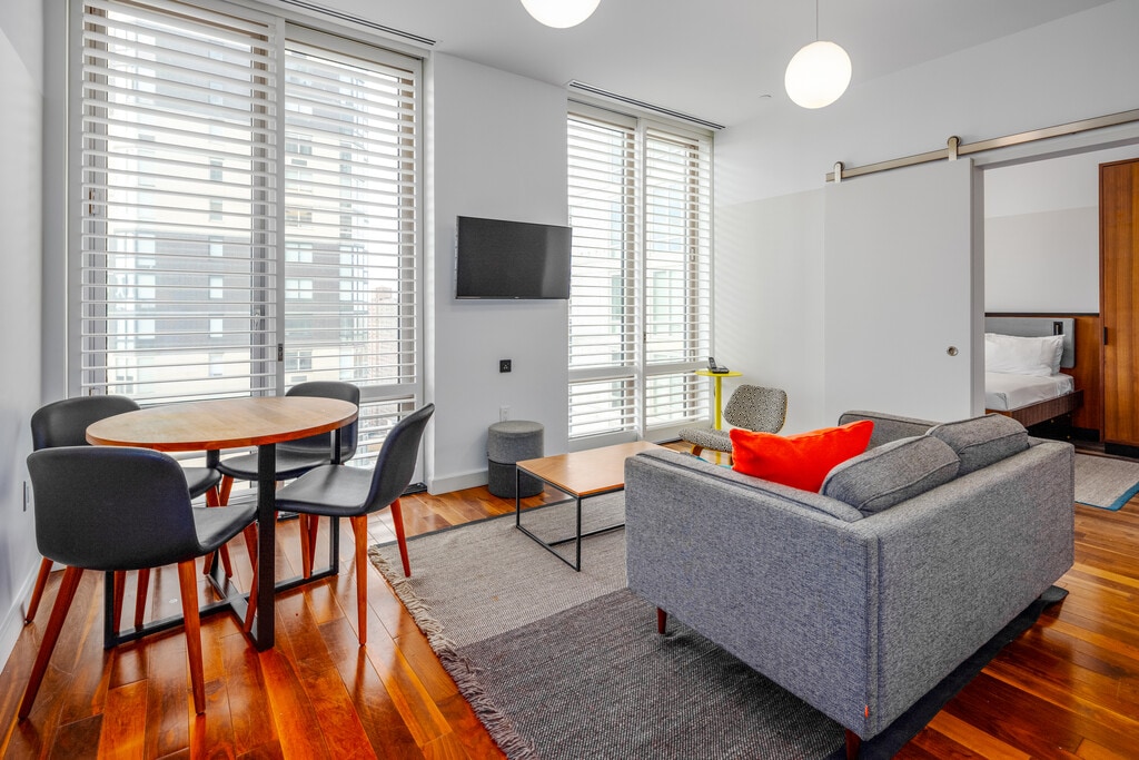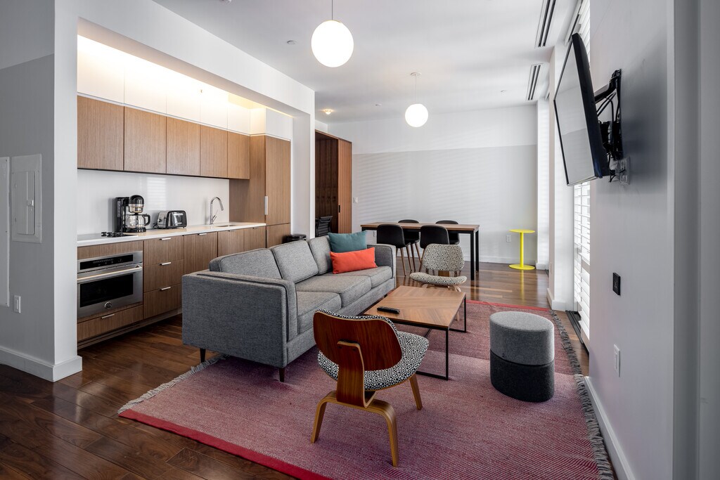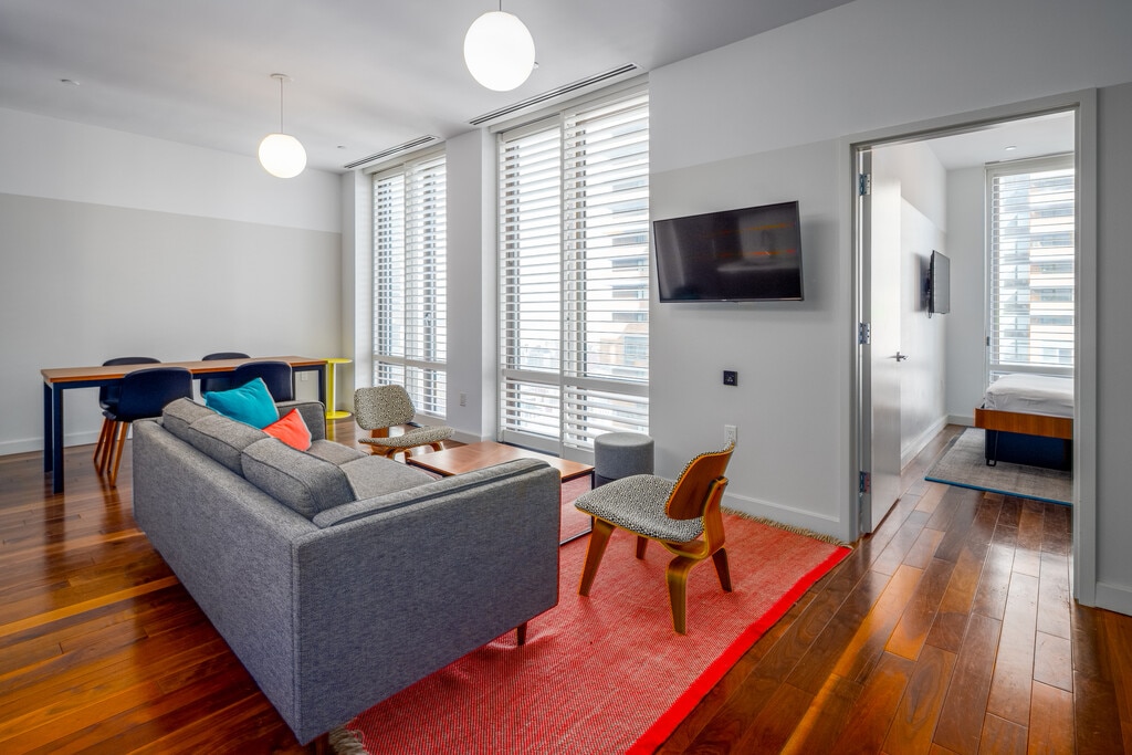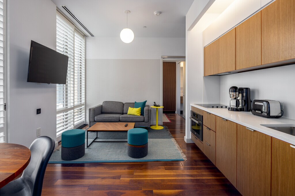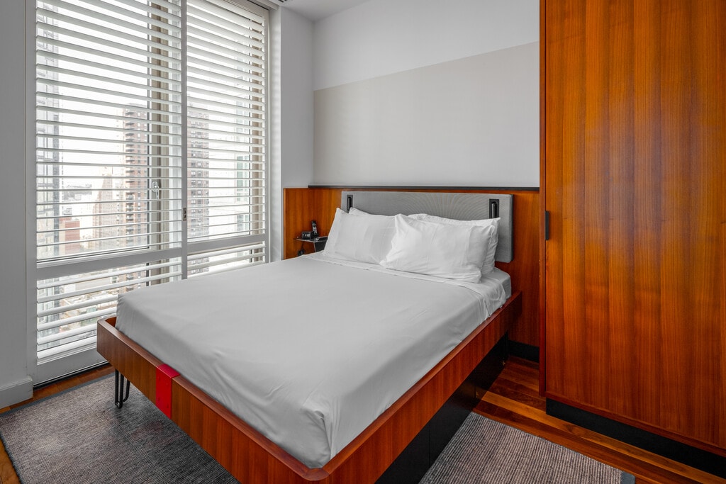 Pod Pads are One & Two Bedroom Fully Furnished Apartments situated at the top of Pod Times Square Hotel. We offer Luxury Boutique convenience and hospitality with all the comforts of a home. Beautiful sun drenched One- & Two-Bedroom Pod Pads. Featuring floor-to-ceiling windows, elegant walnut floors, and panoramic city views. Kitchens fully stocked, offering Bertazzoni ovens and Blomberg appliances. Quartz countertops, and custom mill work. Two-Three Flat Screen TVs, one in each bedroom and living area. Marble bathrooms accoutered with top-of-the-line Hansgrohe fixtures and walk-in showers. Individual Climate Control in each room and living area. High Speed Wi-Fi & Premium Cable. Safe for valuables. Landline phone service with Free Calling. HSKP Services upon request. Minimum 30 Night Stay. Terms & Conditions apply. Rent payable by credit with Zero Processing Fees. Easy & simple National & International Approval & Lease Process. Monthly contracts can be completed in less than a day. Small Security Deposit. Pay first month upon arrival. Close to all the action, but just far enough away—and high above—the hustle and bustle.