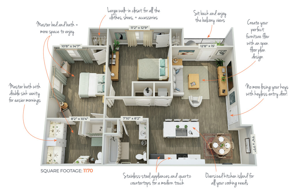 2 Beds, 2 Baths, 1170 sq ftAvailable NowModel Gallery