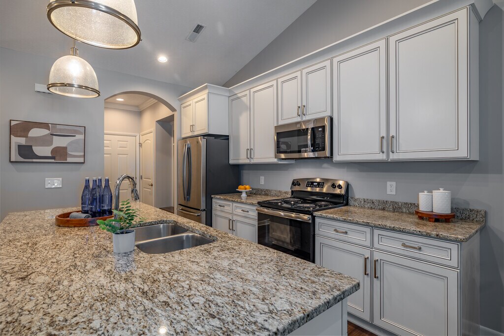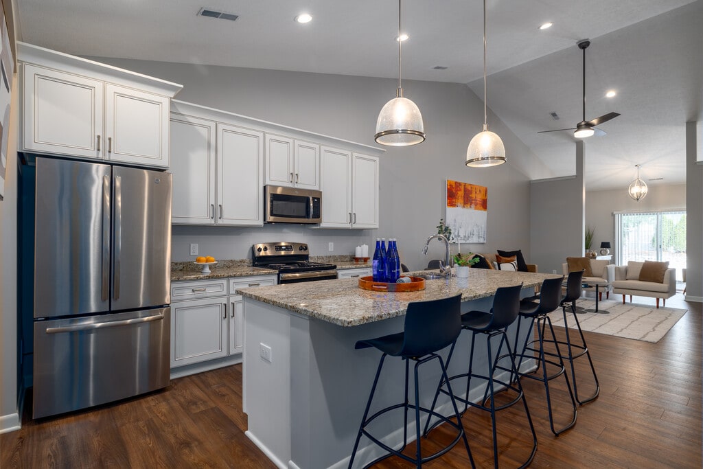 Apartments include the following: Vaulted kitchen, dining, and great room ceilings. Large kitchen island with an eating bar. Separate walk-in pantry. Sun room with vaulted ceiling and sliding patio door. Rear patio off of the sunroom. Mudroom entry from garage with built-in seat and extra closet. Master suite with large walk-in closet. Bedroom #2 or optional den. Full size washer and dryer hookups.