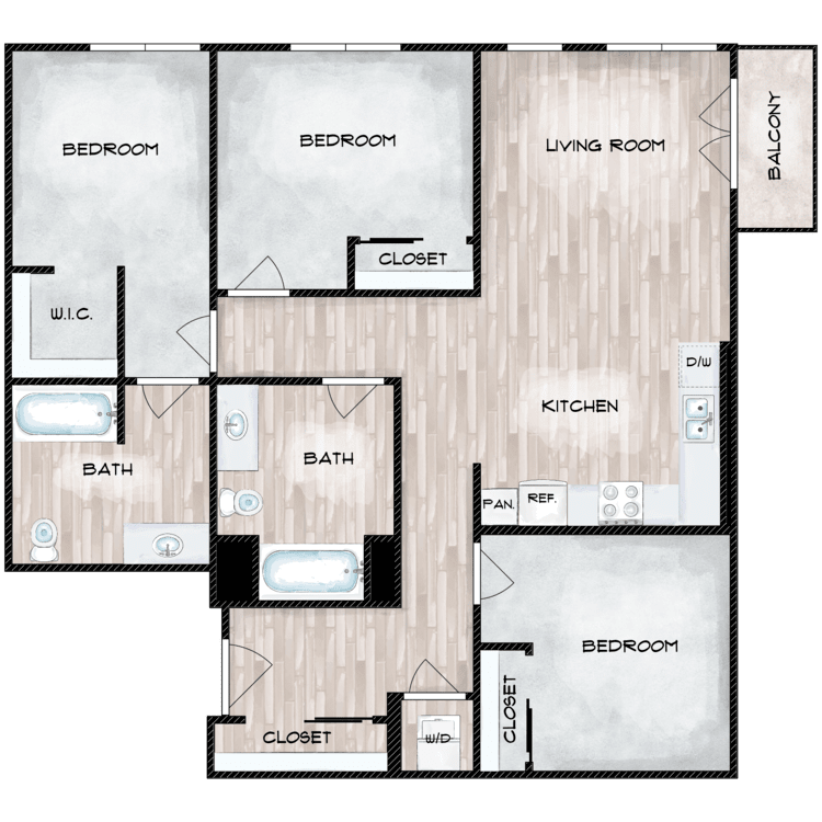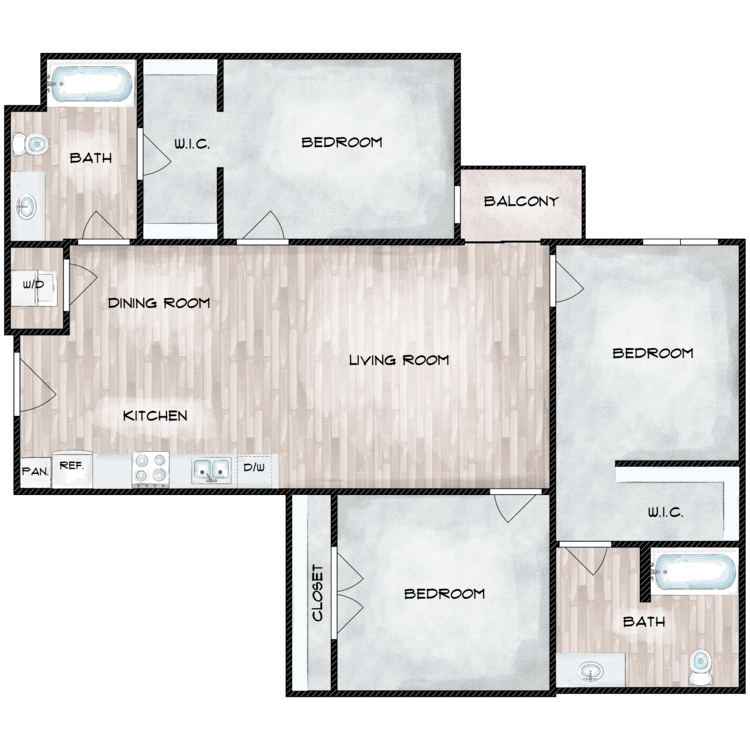 Apartment Model: 3 Bed 2 Bath$2,3793 Bedroom, 2 Bath, 1054-1060 sq ftUnavailable![]()