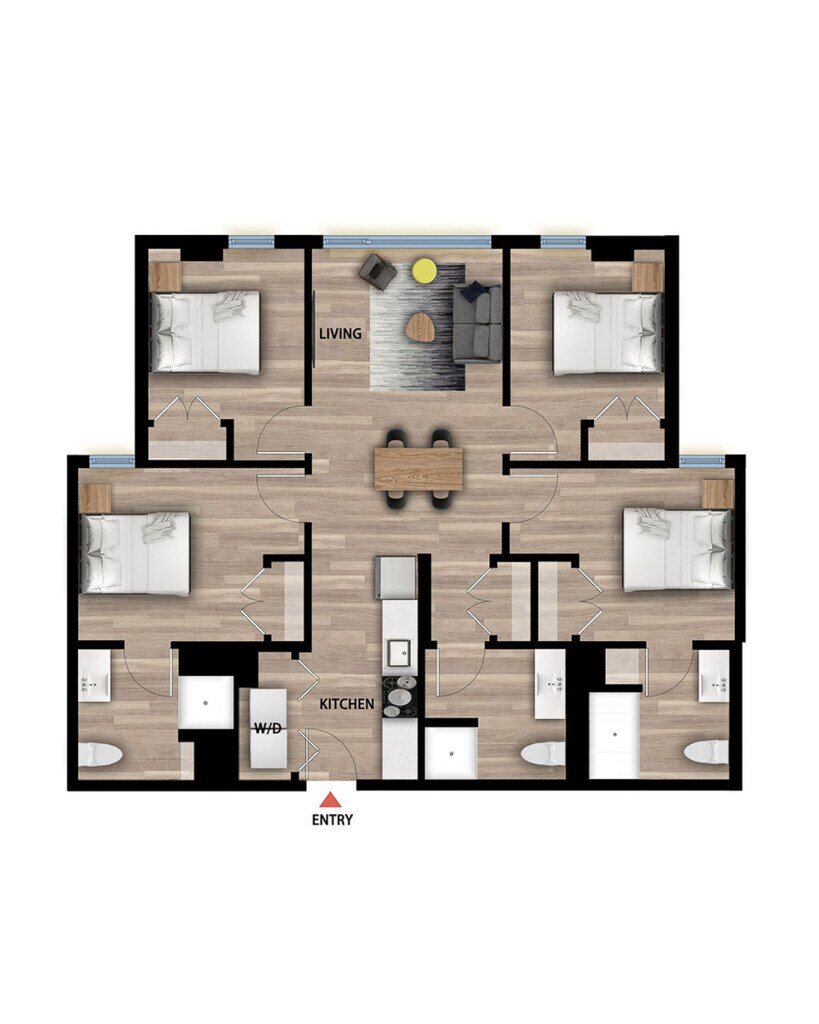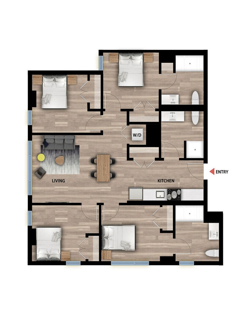 Private Bed in a 3 Bed 2 Bath A - Floorplan 1 Apartment Unit: PrivateBedroomina3Bed2BathAApartment Model: Private Bed in a 3 Bed 2 Bath AFrom $1,4253 Bedroom, 2 Bath, 1051 sq ftAvailable Now4 Bedrooms